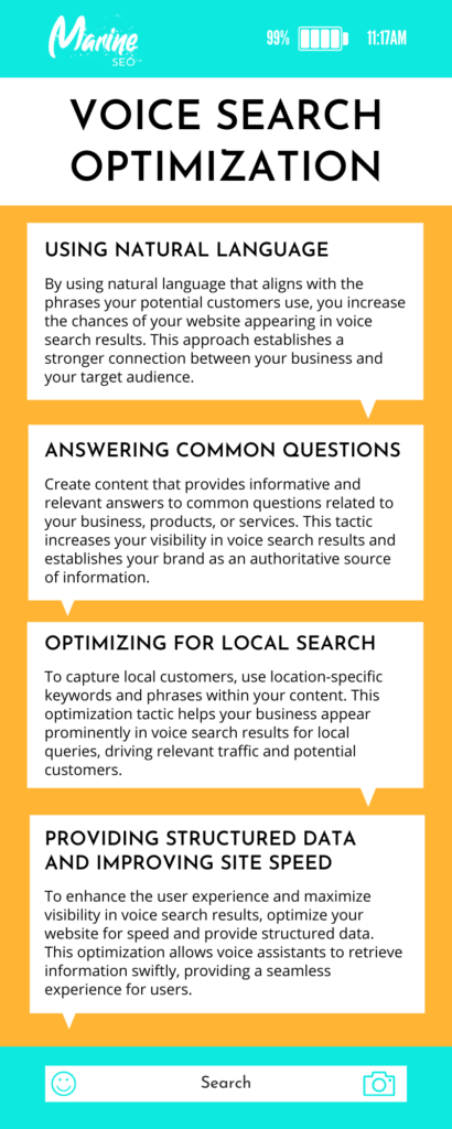 Optimization for voice search can be used in many ways, including in Fort Lauderdale social media marketing. It involves making sure your content is easily accessible and understandable by voice assistants by using natural language and conversational tone. This also includes optimizing for long-tail keywords, answering common questions, and providing concise and relevant answers.